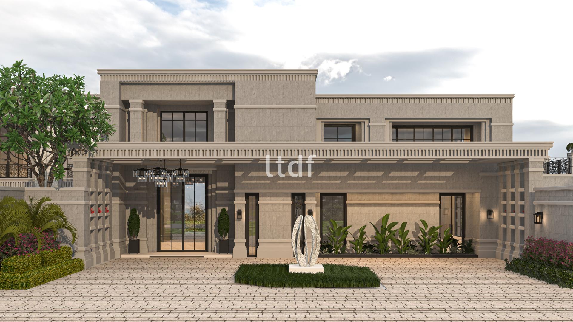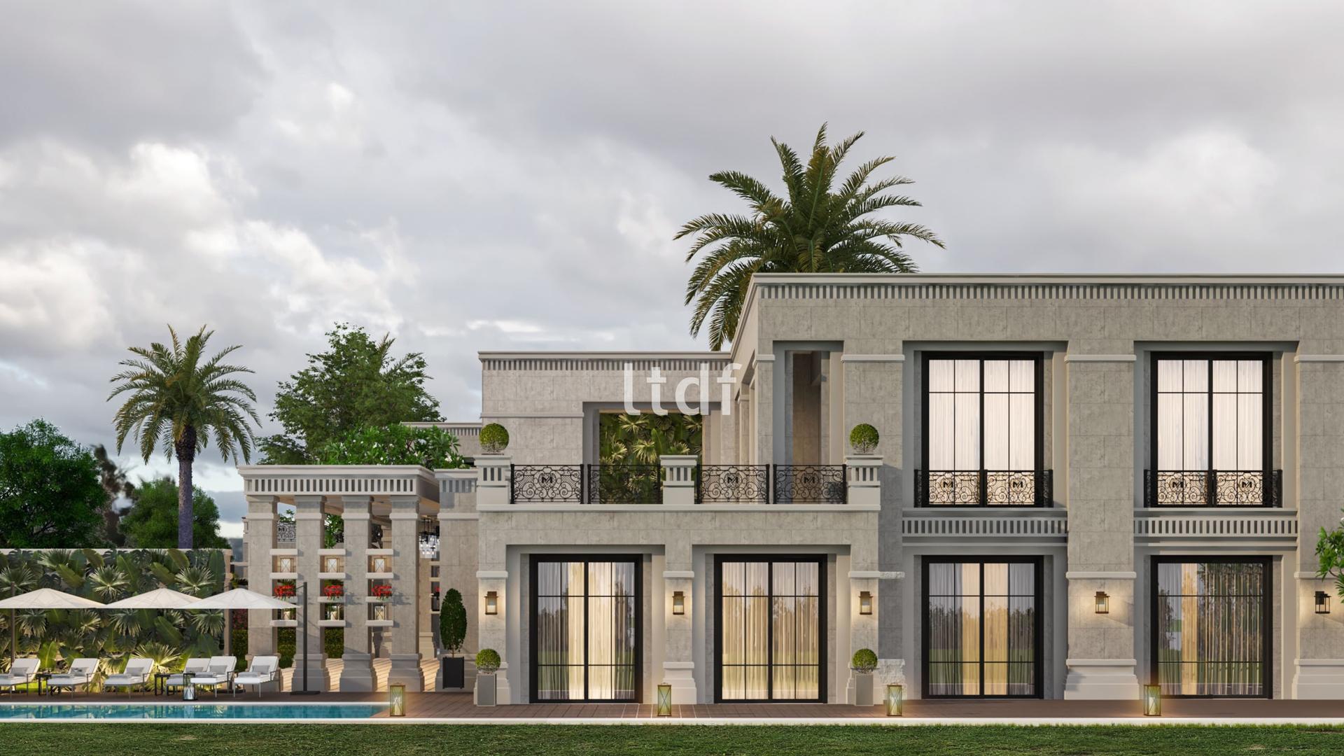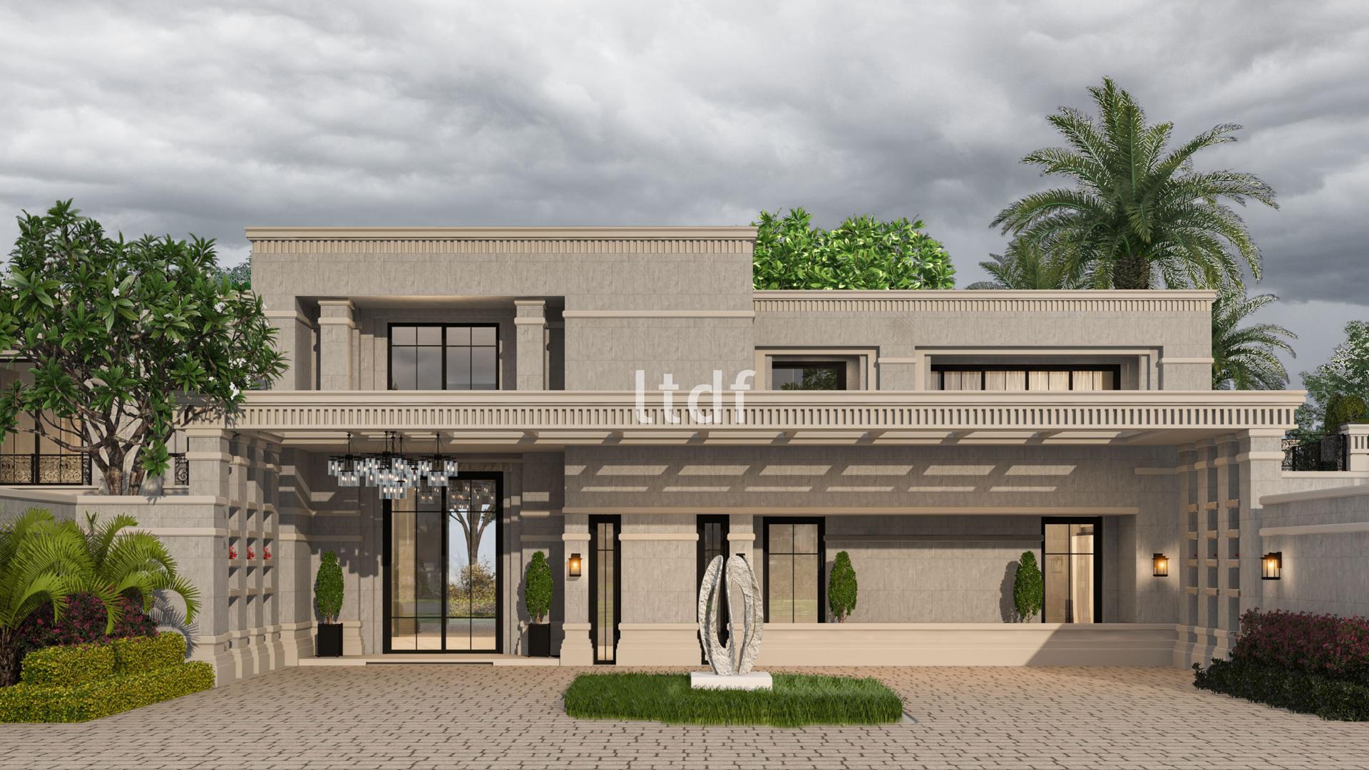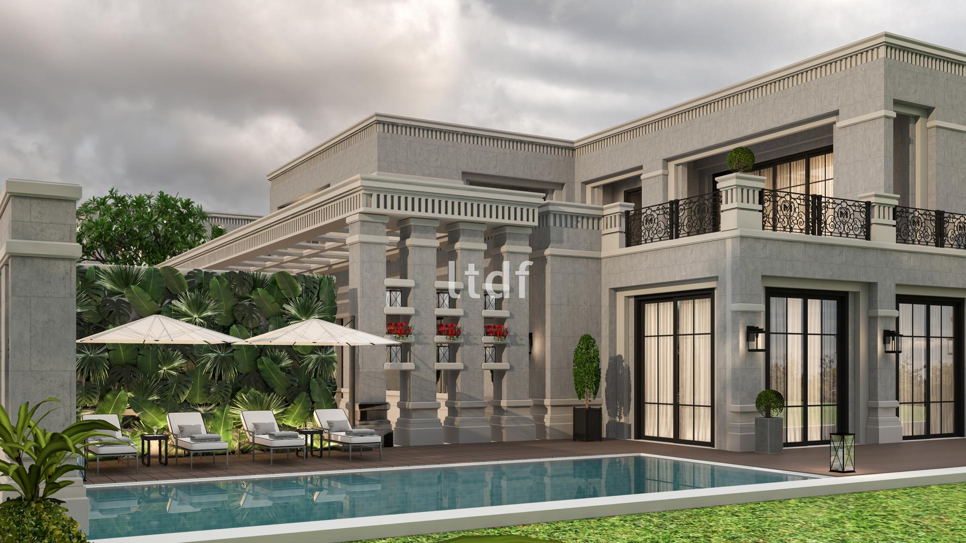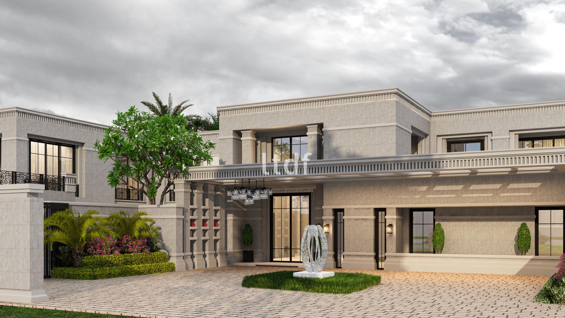 This luxurious residential project showcases a modern architectural design seamlessly integrated with classical elements. The grand facade features large windows, elegant balconies with ornate ironwork, and a sophisticated color palette, enhancing its opulent appeal. The outdoor area is landscaped with tropical foliage, surrounding a sleek swimming pool and a stylish lounge area, creating a serene and inviting environment. This project exemplifies a harmonious blend of elegance, functionality, and comfort, making it a perfect retreat for discerning homeowners seeking a lavish lifestyle.