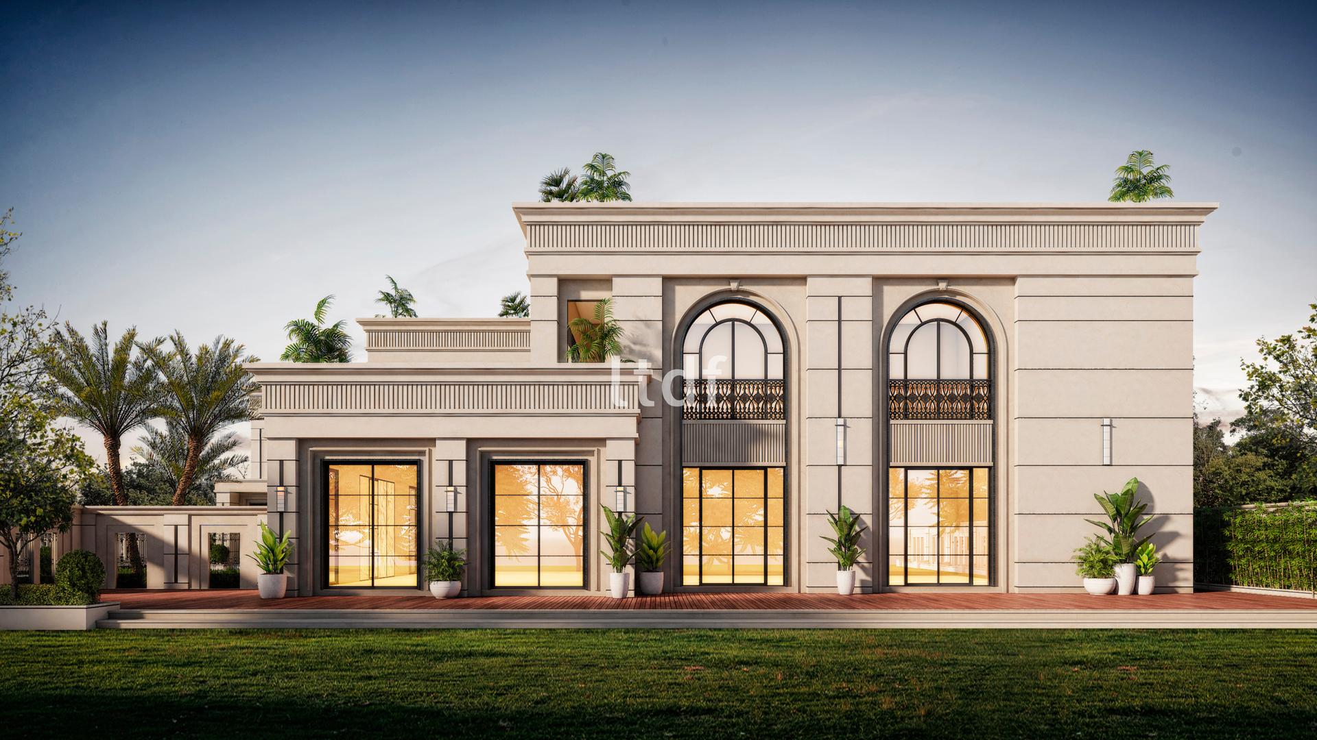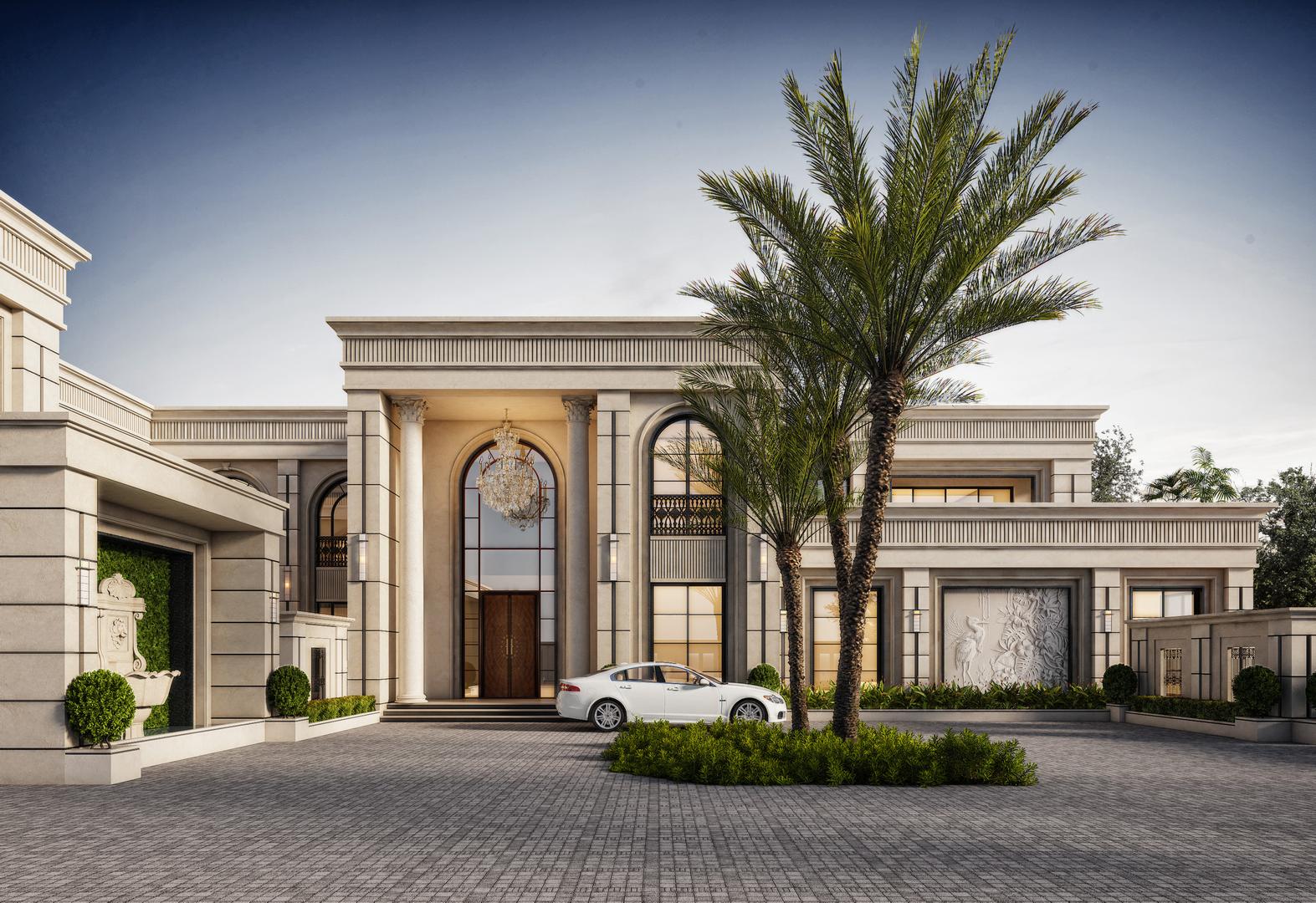 This luxurious residential project showcases a neoclassical architectural design seamlessly integrated with modern elements. The grand facade features large, symmetrically arranged windows, elegant balconies adorned with ornate ironwork, and a sophisticated color palette of soft neutrals, enhancing its opulent appeal. The outdoor area is landscaped with lush tropical foliage creating a welcoming atmosphere. This project exemplifies a harmonious blend of classical elegance, modern functionality, and ultimate comfort, making it a perfect retreat for discerning homeowners seeking a lavish lifestyle.